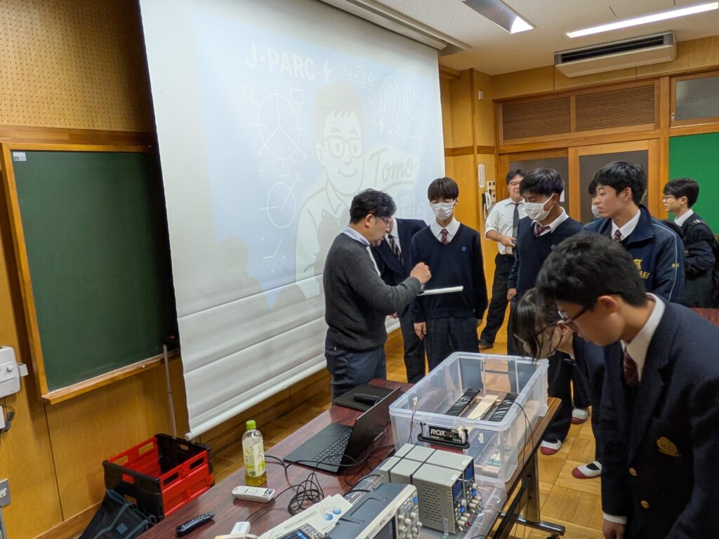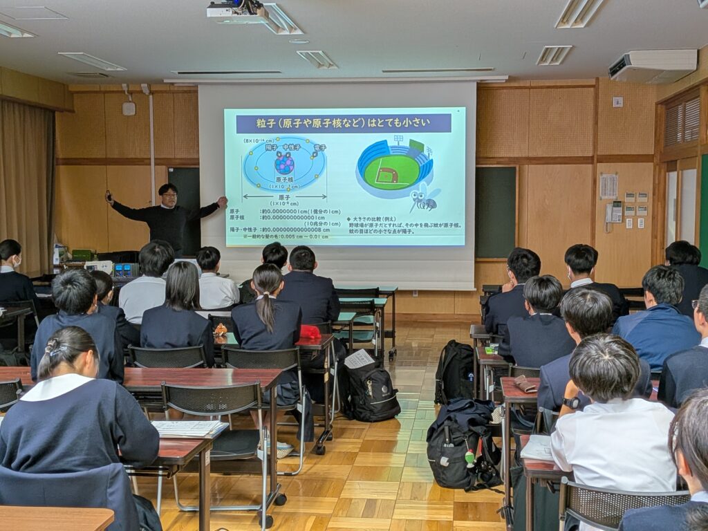 原研と高エネルギー加速器研究機構の両方に属している高柳様から、まずはJ-PARC(大強度陽子加速器施設)の研究内容を紹介いただきました。研究に利用している加速器の説明を、生徒に質問を投げかけながら、図やアニメーションを使って分かりやすく解説いただきました。一見難解な研究内容も、中学・高校レベルでも分かるレベルに落とし込んで説明いただき、熱心にメモを取りながら頷く生徒の姿もありました。大強度陽子ビームの説明を聞き、実際の施設の加速器の写真を見た生徒たちは、「世界最大級の施設が、こんなにも身近にある」ことに驚いていました。