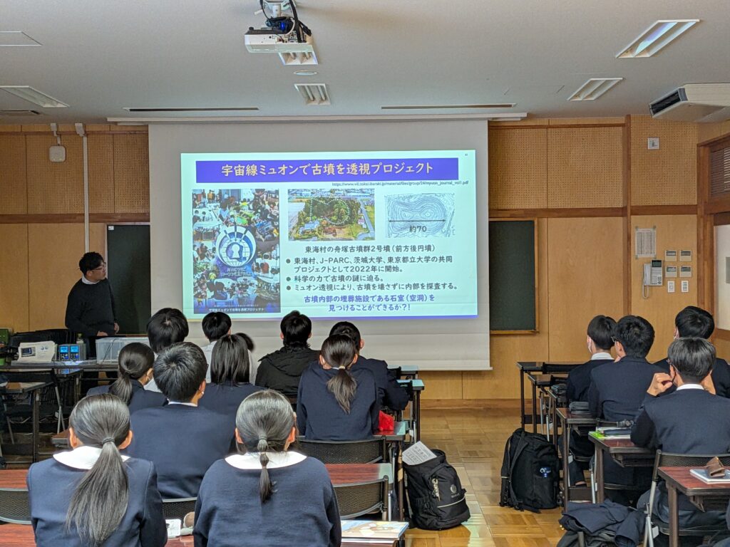 その後、研究を利用した「宇宙線ミュオンで古墳を透視プロジェクト」の紹介に移りました。このプロジェクトは、ピラミッド内部の調査で使用された実績をもつ「宇宙線ミュオン」を使用して、施設を破壊せずに内部を調査するという試みです。小学生から大学生までが参加し、現在も進行中のこのプロジェクトに生徒もロマンと魅力を感じたようで、目を光らせながら聴いていたのが印象的でした。この「古墳を透視プロジェクト」もそうであるように、昨今では、今後の社会において「文理融合の学び」が必要という認識が高まっています。高校では、大学入試を踏まえて「文系」と「理系」とに分かれますが、それは単なる便宜上のものであり、社会ではそのような区分を超越した「文理融合の素養」が必要であるからです。今回ご講義いただいた内容は、「Co-Labo」開講理念の1つである、既存の学問分野に捉われない「学際的視野の涵養」という理念にも合致したものであり、生徒の満足度も非常に高かったように感じました。本校の卒業生でもある高柳様の、今後の進路選択も踏まえたお話は、生徒にとって新鮮かつ深い学びの機会となりました。