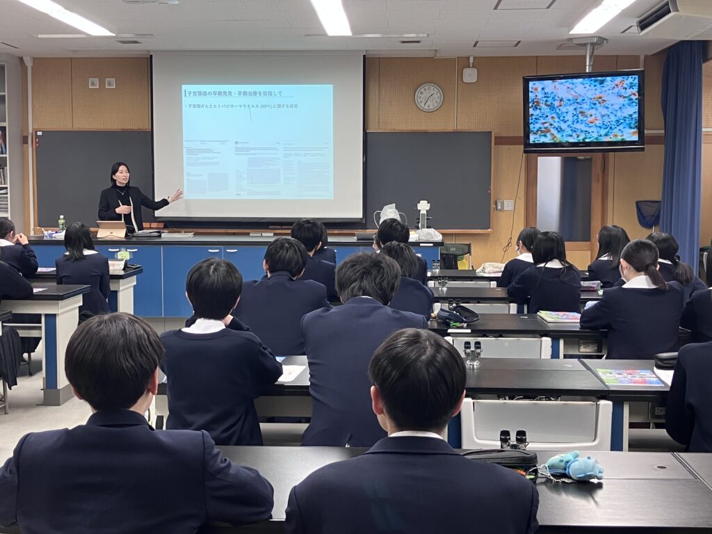 2月7日、国際医療福祉大学医療検査学科より岡山香里先生をお招きし、特別講座を実施しました。 本講座では、がんのしくみについて、高校生にも理解しやすい形でご講義いただくとともに、細胞診断の実際について、写真資料を用いながら疑似的に体験する機会を設けていただきました。 がんの発生や細胞の変化に関する内容は、現在生徒たちが学習している高校生物の内容と密接に関連しており、教科書での学びに一層の深みを与えるものとなりました。 また、臨床検査技師・細胞検査士の仕事にとどまらず、がん医療に関わるさまざまな職種や役割についてもご紹介いただき、生徒たちは医療が多職種連携によって支えられていることを実感することができました。 専門的な内容でありながらも丁寧で分かりやすい講義に、生徒は強い関心を示し、将来の進路について考える貴重な機会となりました。