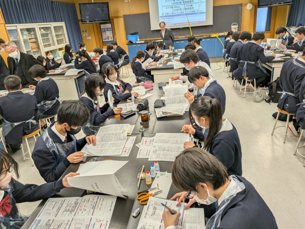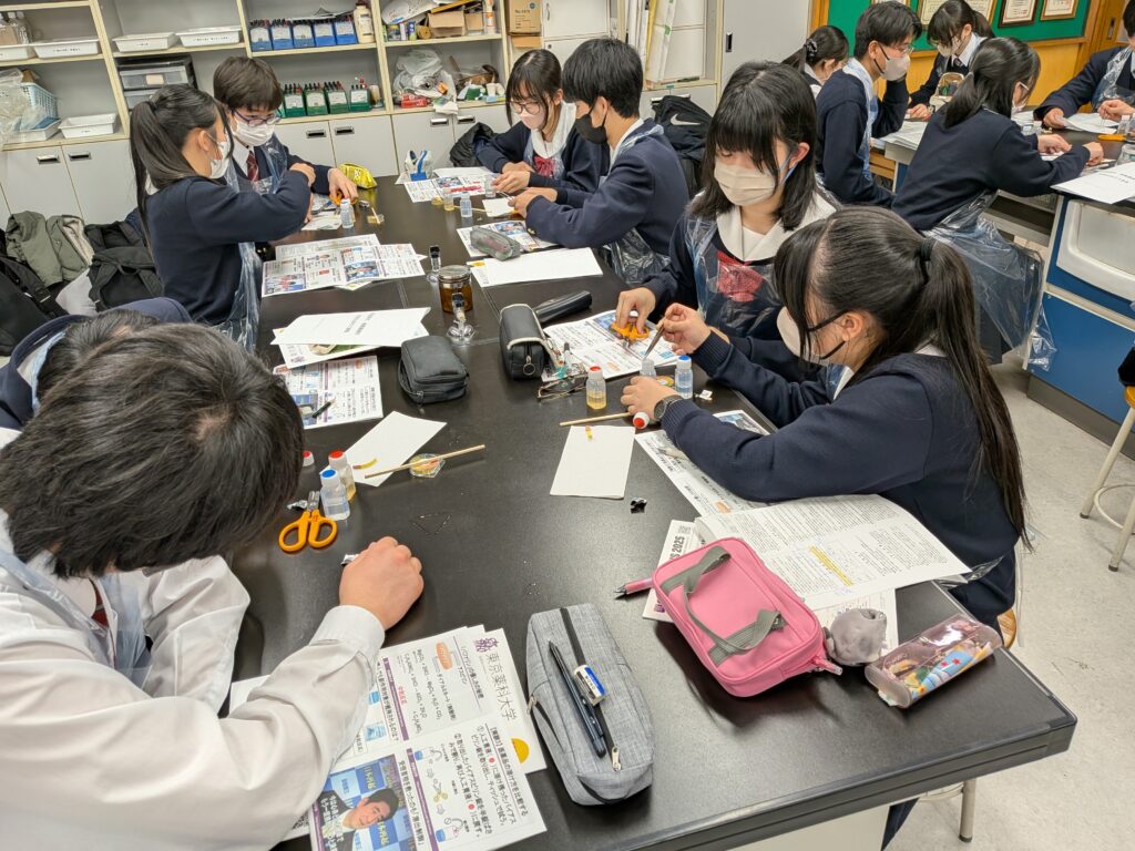 別生先生には、「実験で学ぶ 体内でのくすりの運命」というテーマでご講義いただきました。ドラッグストアで実際に販売されている市販薬を使用し、鎮痛薬成分に焦点を当てて実験を行いました。同じ成分でも、容量によって効果・効能が変化することを講義で学び、実験に移りました。実験では、「気がついたことや違いをすべて記録する」という大学での実験における基本姿勢を、生徒たちは体験することができました。