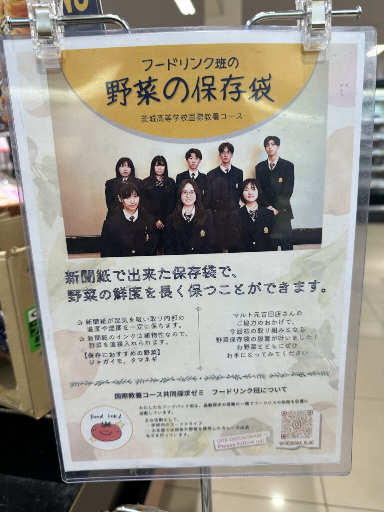 フードリンク班は協働探究ゼミにおいて、フードロス解消を目的として活動しており、これまで校内におけるフードバンク活動や文化祭において規格外野菜を取り入れたカレーの販売などを行ってきました。今回は新聞紙製の野菜袋の作成という企画の発案から、マルト様への直接交渉、企画の実現に至るまですべて生徒が主体となって行ってきました。ご協力いただいたマルト様には紹介文まで用意していただき(写真下)、厚く御礼申し上げます。