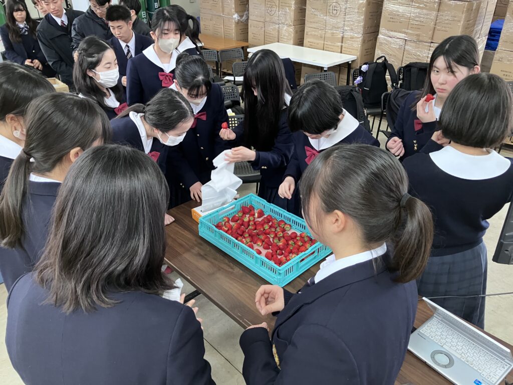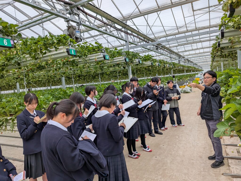 最初に、(株)ファーマ村いちご農園 代表取締役 川島 浩司様の案内で、農園施設を見学しました。24万株の栽培を実現した上下可動式リフティングシステムや、いちごに適した生育環境をつくる統合環境制御システム、環境負荷の少ない農業を目指した循環式養液栽培などの、最新鋭かつ環境に配慮した設備を直に見学しました。生徒たちはメモを取り、積極的に手を挙げて質問するなど、最新鋭の施設に目を輝かせながら熱心に話を聴いていました。
