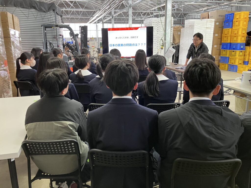 施設見学の後は、日本における主な農業課題や、その解決に挑戦する(株)ファーマインドの取り組みについての講義に移りました。事前研修でも考えを深めた農業課題については、生徒たちからも考えを発表する姿が見られました。ファーマ村いちご農園を建設する過程の話から見えてきた、農地集約化の難しさや、生産者と消費者をつなぐ取り組みについてなど、後継者不足等の課題に繋がる問題には、生徒たちとって新しい発見だったようです。なかでもいちご農家の数は10年間でほぼ半減しており、農家不足が顕著になっていますが、敢えてその分野に挑戦した川島様のお話から、農業界への熱い思いを感じ取ることができました。