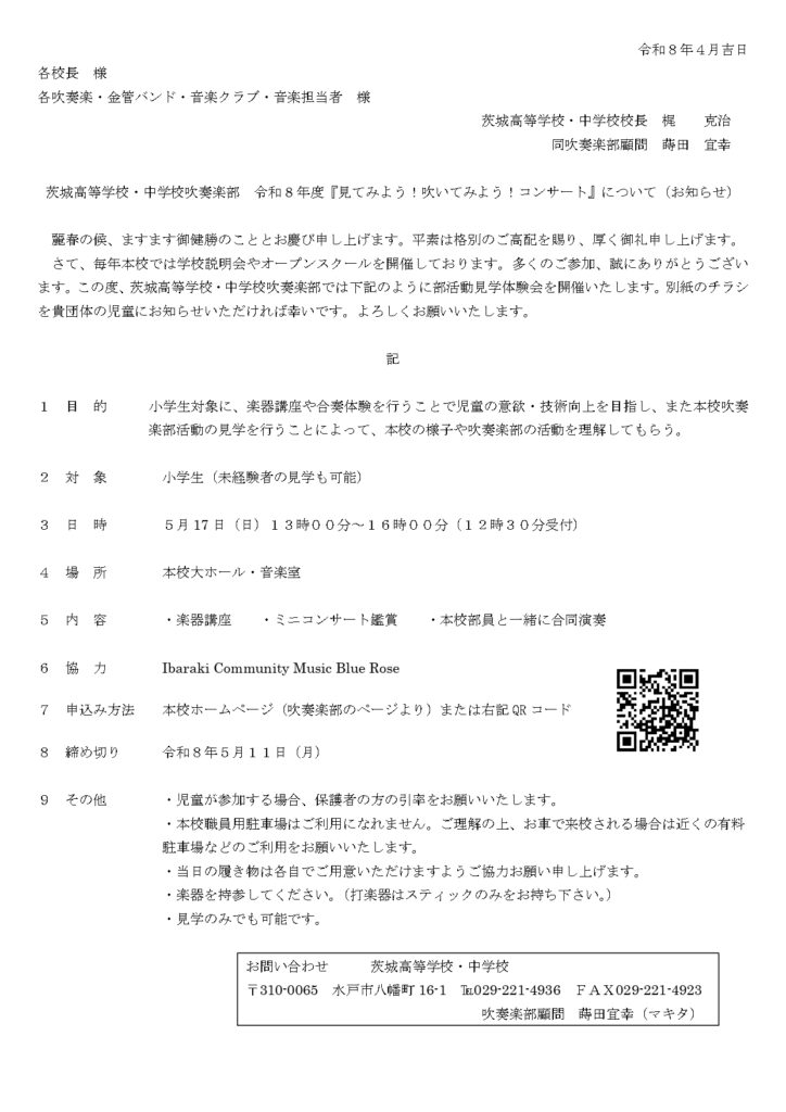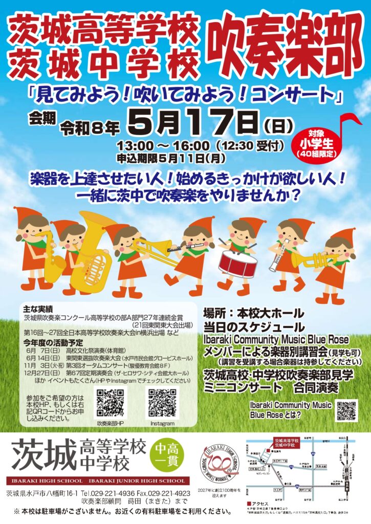 5月17日(日)に小学生対象に「見てみよう!吹いてみよう!コンサート」を開催します。当日は、Ibaraki Community Music Blue Roseのメンバーによる楽器講座も開催します。最後には本校生徒と一緒に演奏できればと思います。ぜひご参加ください。前回参加いただいたみなさんから、「参加してよかった」とのお声もいただいております。楽器未経験者は見学のみでも大丈夫です。