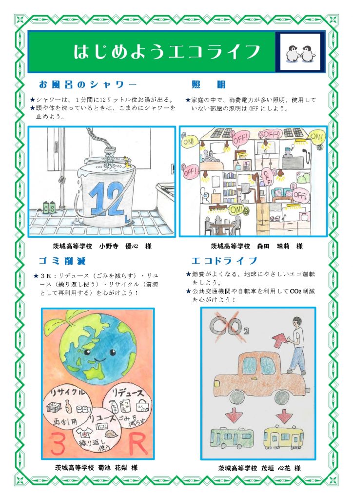 茨城県「エコライフリーフレット」イラスト募集に応募した本校の高校2年生4名の作品が入選しました。